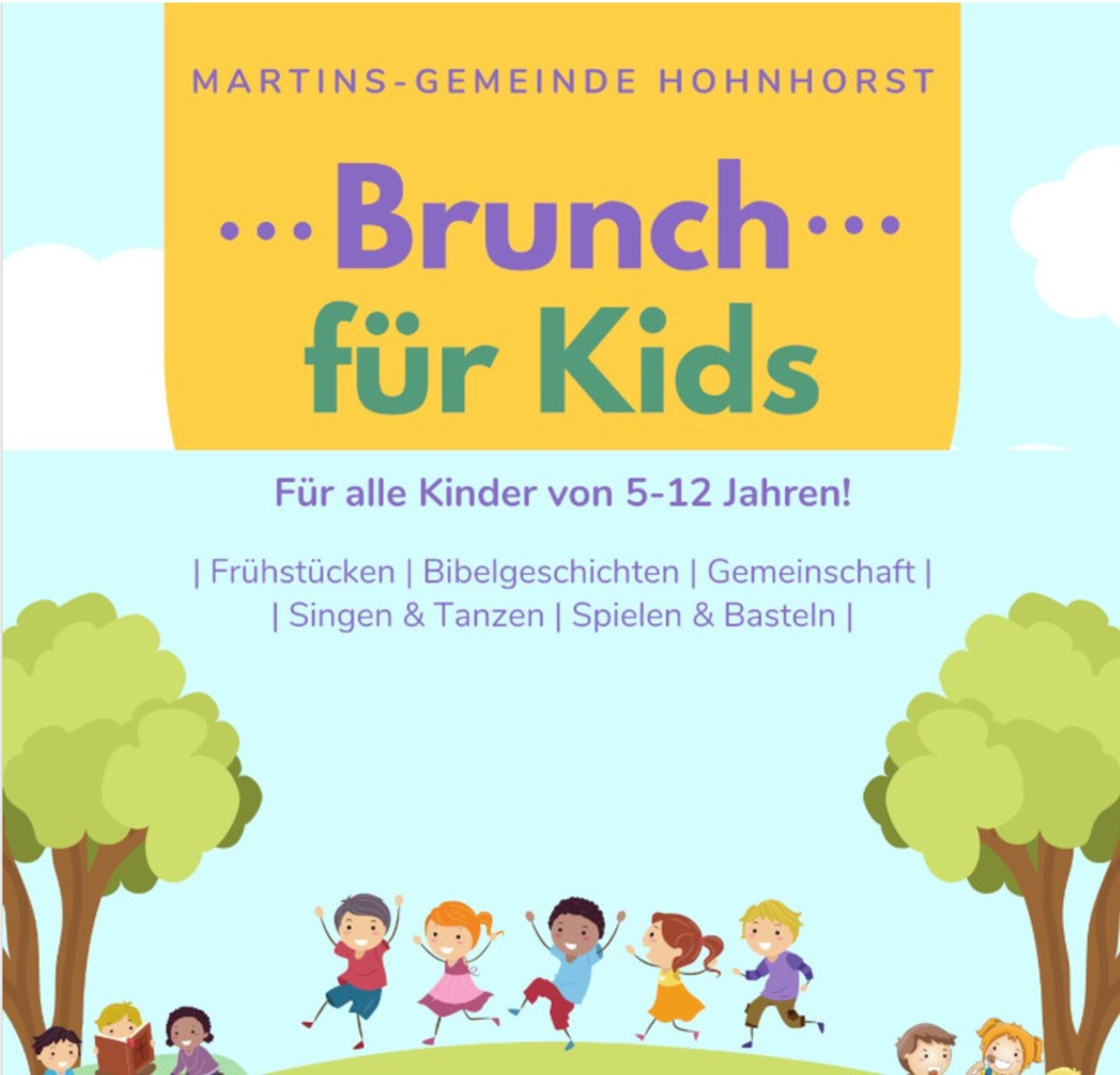 Gemeinsam mit dem Brunch für Kids-Team tauchen alle Kinder von 5 bis 12 Jahren beim Brunch für Kids in cooles und spannendes Thema ein. Neben einem leckeren Frühstück, das das jeweilige Thema aufgreift, singen und tanzen wir zu Songs mit der "Brunch für Kids-Band" und hören gemeinsam aufregende Geschichten aus der Bibel oder von Menschen, die besondere Erlebnisse mit Gott hatten! Vertieft wird das Gehörte mit vielen Spielen und Aktivitäten in gemeinsamen Gruppen: Basteln, Rennen, Tanzen, Denken, Hüpfen, Suchen, Hören, Balancieren, Schießen, Essen, Malen, Beten, Fühlen, Riechen, Erinnern, Singen - hier ist für jeden Etwas dabei!